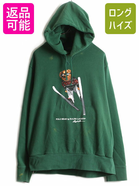 【24h限定 10%OFF&P5倍】 ポロベア ■ POLO ポロ ラルフローレン スキー ジャンプ ビッグプリント 前V スウェット フード パーカー ( メンズ XL ) 古着 緑 スエット| 中古 RALPH LAUREN プルオーバー ポケット付き グリーン トレーナー 裏起毛 スウェットトレーナー フーデ